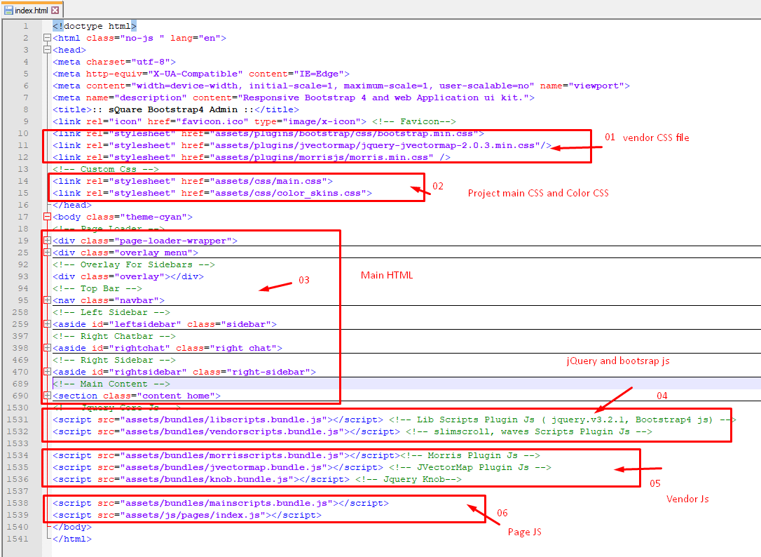 sQuare admin.js is the mail javascript file having all the js code. File is located in assets/js/ folder. This file code is also well formatted and section in different respective function names.