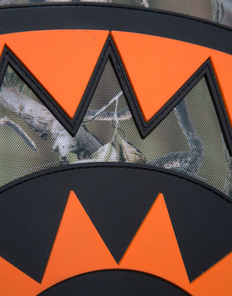 This is the Hunter Rubber Shark Backpack by Sprayground. Up your street style game with this backpack! This iconic shark mouth print appears in orange on the front of the bag against a wildlife print background, with orange shark eyes on the side. The backpack features individual laptop and sunglass pockets with ergonomic straps big enough to hold a day worth of gear. All bags are limited edition and never produced again so get yours before they are gone forever!