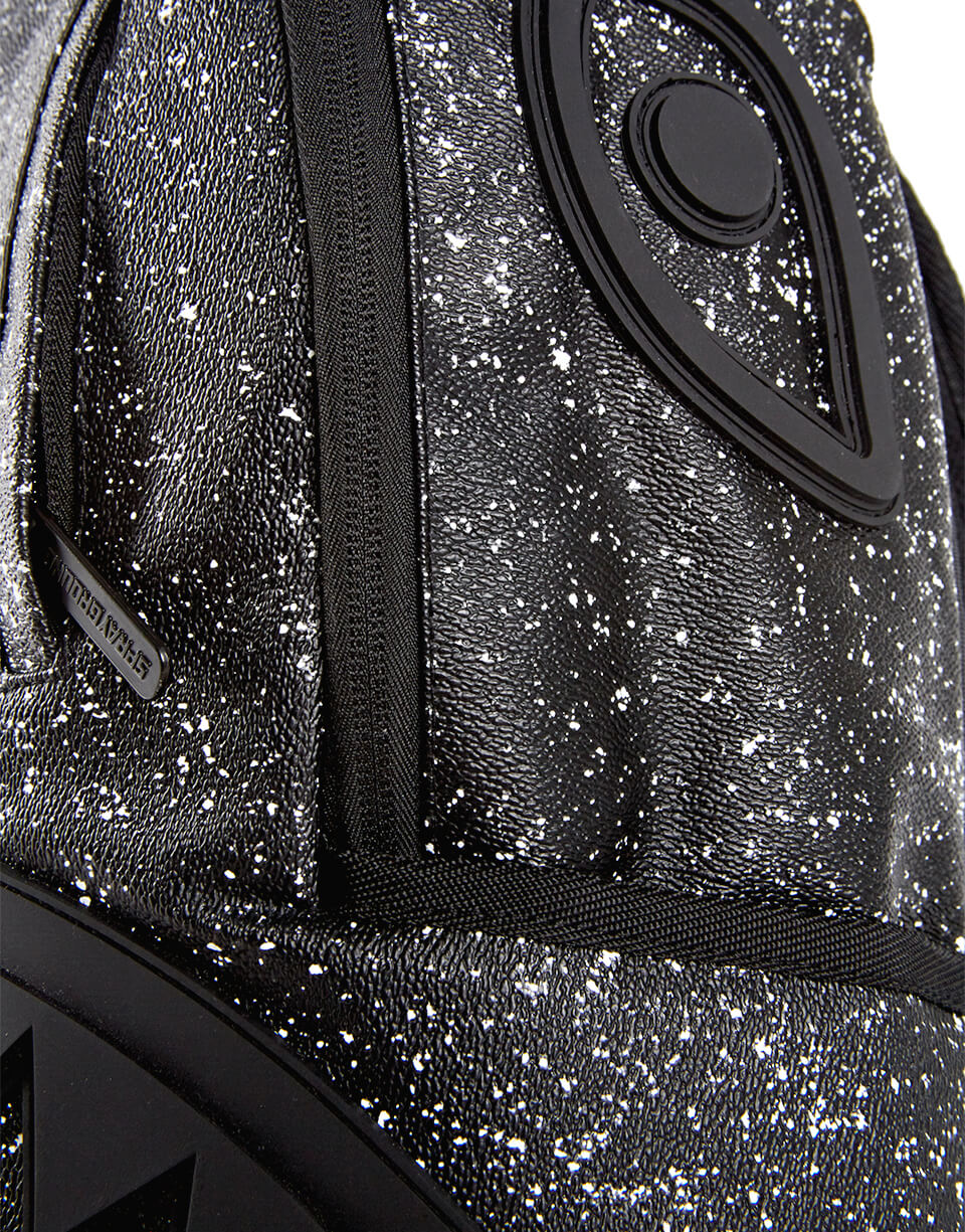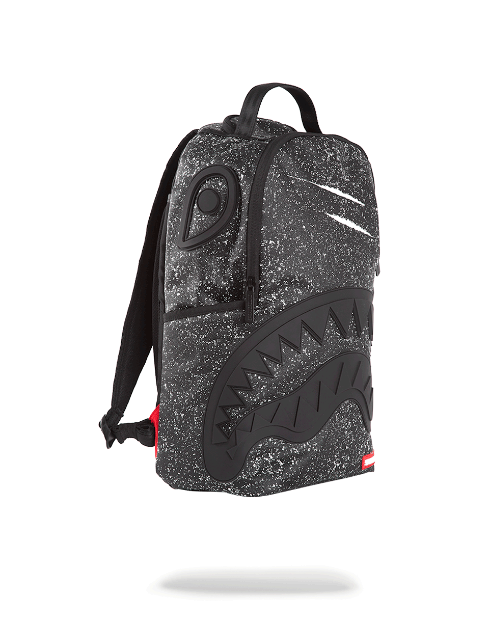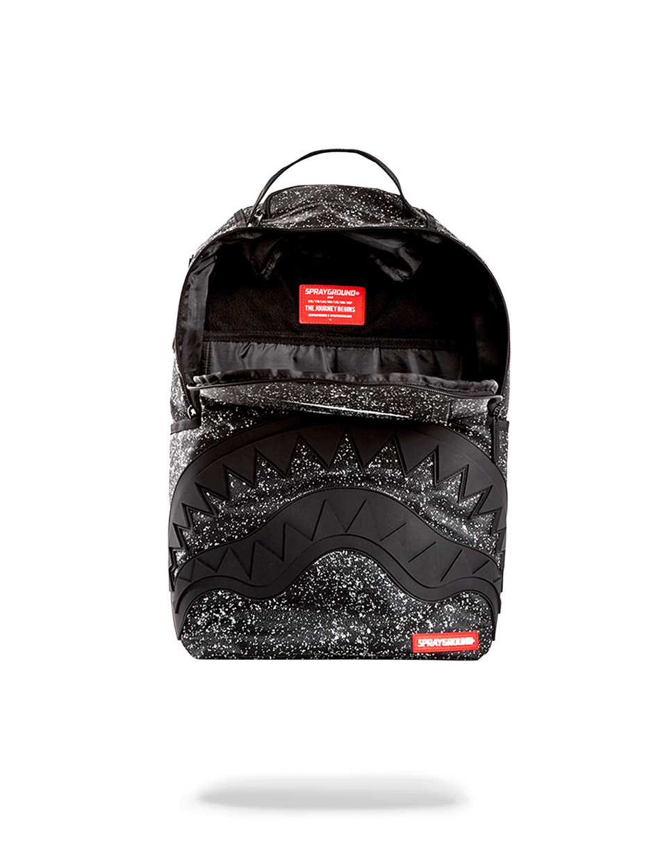 This is the Party Shark Backpack by Sprayground. This iconic shark mouth print appears in black rubber with a black starry night background print. The bag was designed with black edges and black shark eyes on the side of the bag. Featuring individual laptop and sunglass pockets with ergonomic straps big enough to hold a days worth of gear. All bags are limited edition and never produced again so get yours before they are gone forever!