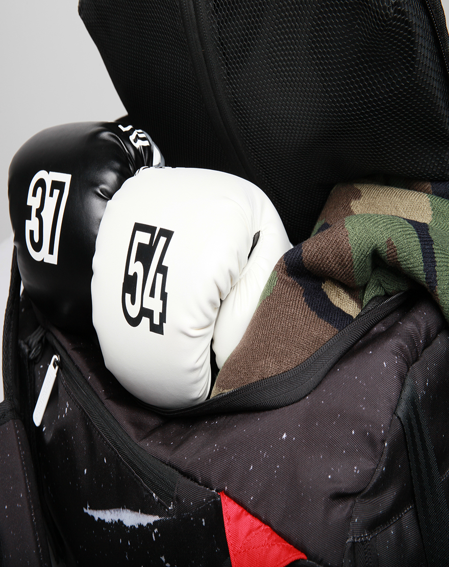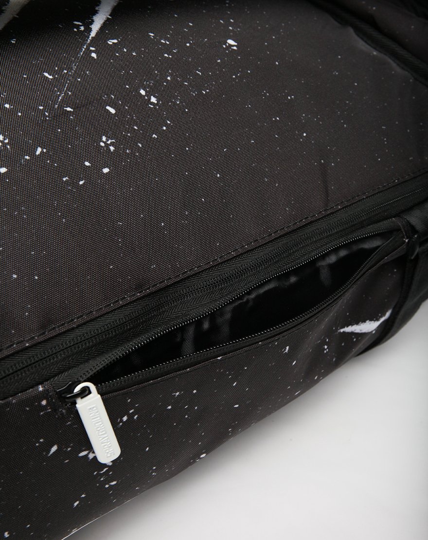 This is the Party Shark Duffle bag by Sprayground. This iconic shark mouth print appears in black rubber with a black starry night background print. The bag was designed with black edges and black shark eyes on the side of the bag. Featuring individual laptop and sunglass pockets with ergonomic straps big enough to hold a days worth of gear. All bags are limited edition and never produced again so get yours before they are gone forever!