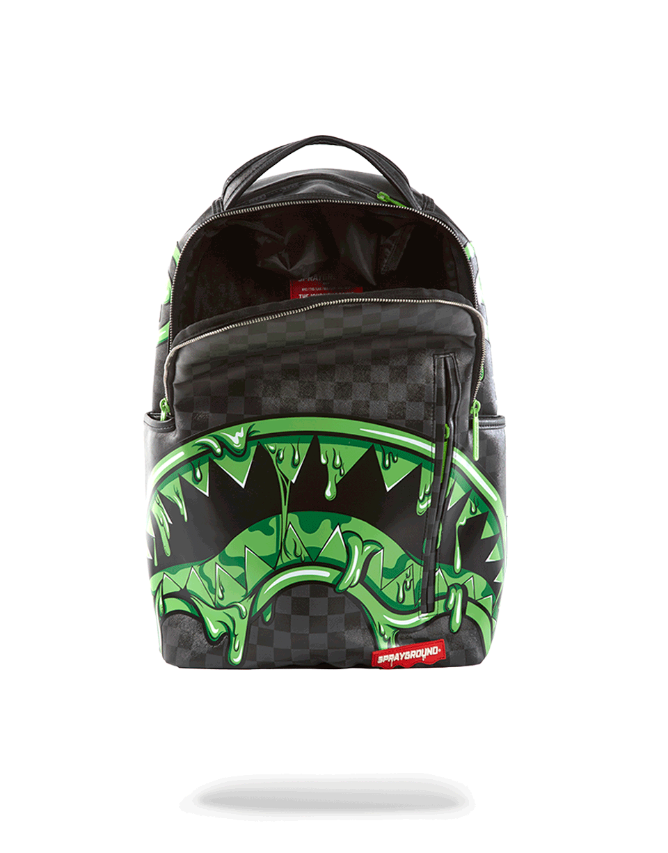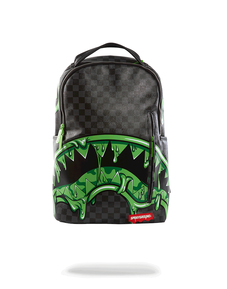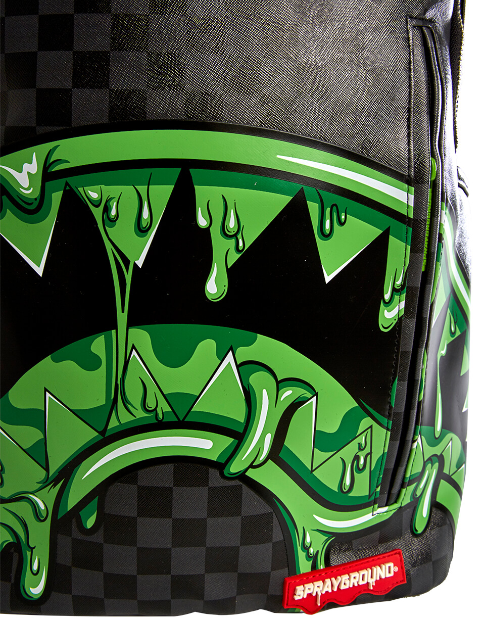 This is the Slime Shark Checkered Backpack by Sprayground. This iconic shark mouth print appears on the front of the bag in green dripping slime against a black checkered background, and green shark eyes on the sides. The backpack features individual laptop and sunglass pockets with ergonomic straps big enough to hold a day worth of gear. All bags are limited edition and never produced again so get yours before they are gone forever!