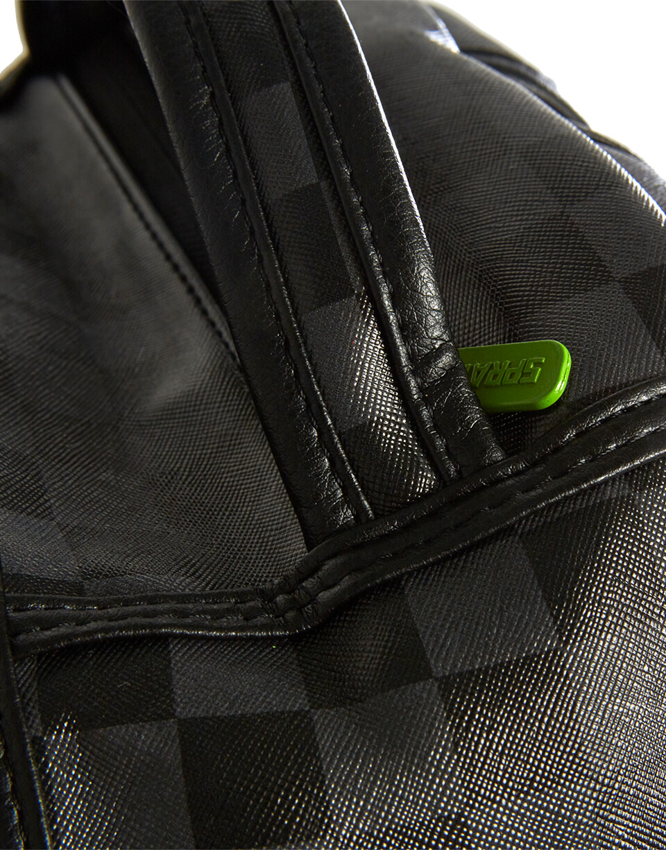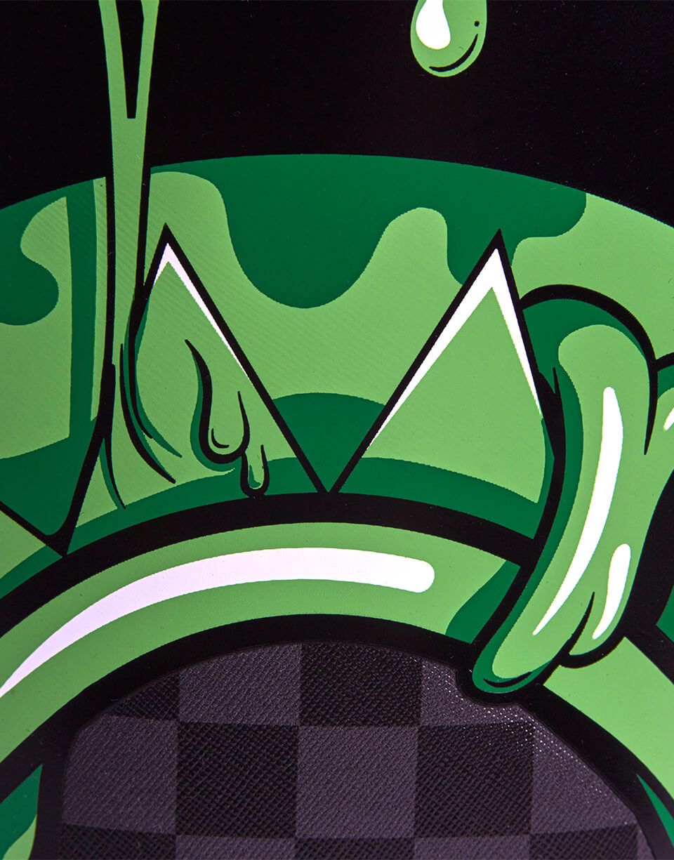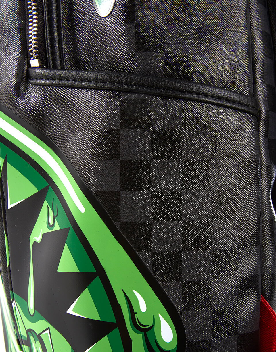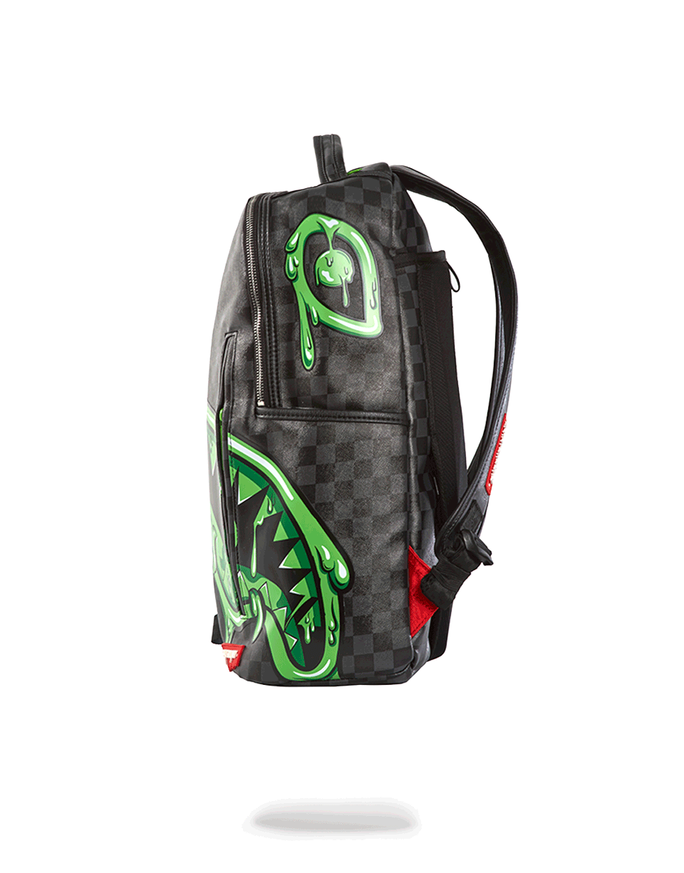 This is the Slime Shark Checkered Backpack by Sprayground. This iconic shark mouth print appears on the front of the bag in green dripping slime against a black checkered background, and green shark eyes on the sides. The backpack features individual laptop and sunglass pockets with ergonomic straps big enough to hold a day worth of gear. All bags are limited edition and never produced again so get yours before they are gone forever!
