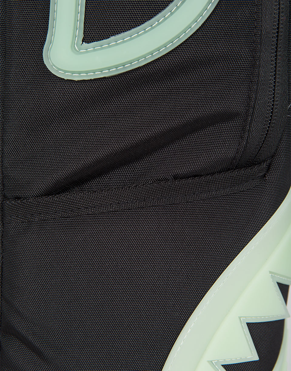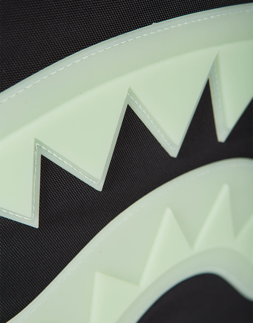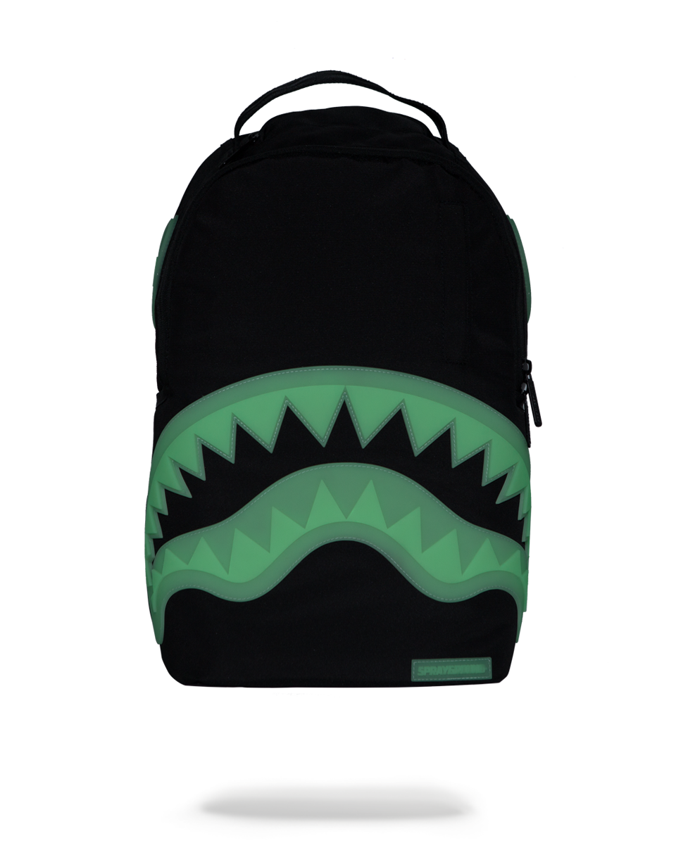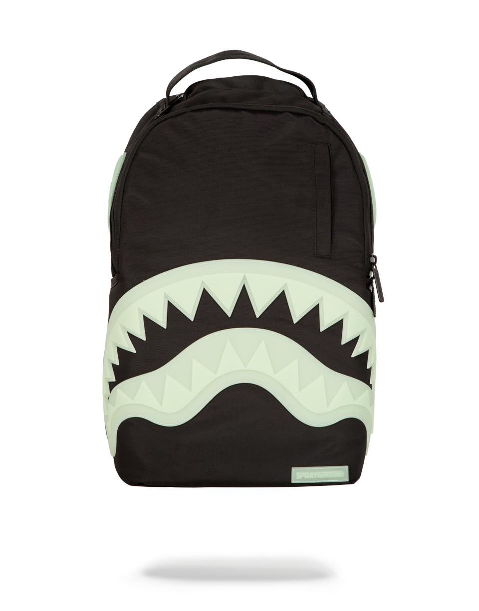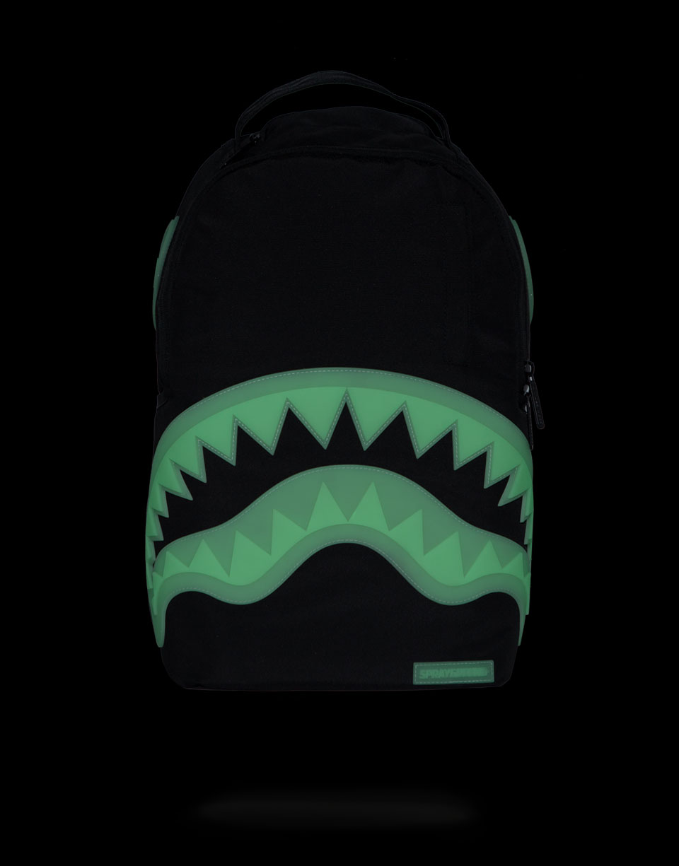 This is the Glow in the Dark Shark Backpack by Sprayground. This iconic shark mouth print is back in a glow in the dark version. Designed with a black background and glow in the dark mouth and eyes, this backpack is perfect of any time of day. Featuring individual laptop and sunglass pockets with ergonomic straps big enough to hold a days worth of gear. All bags are Limited edition and never produced again.