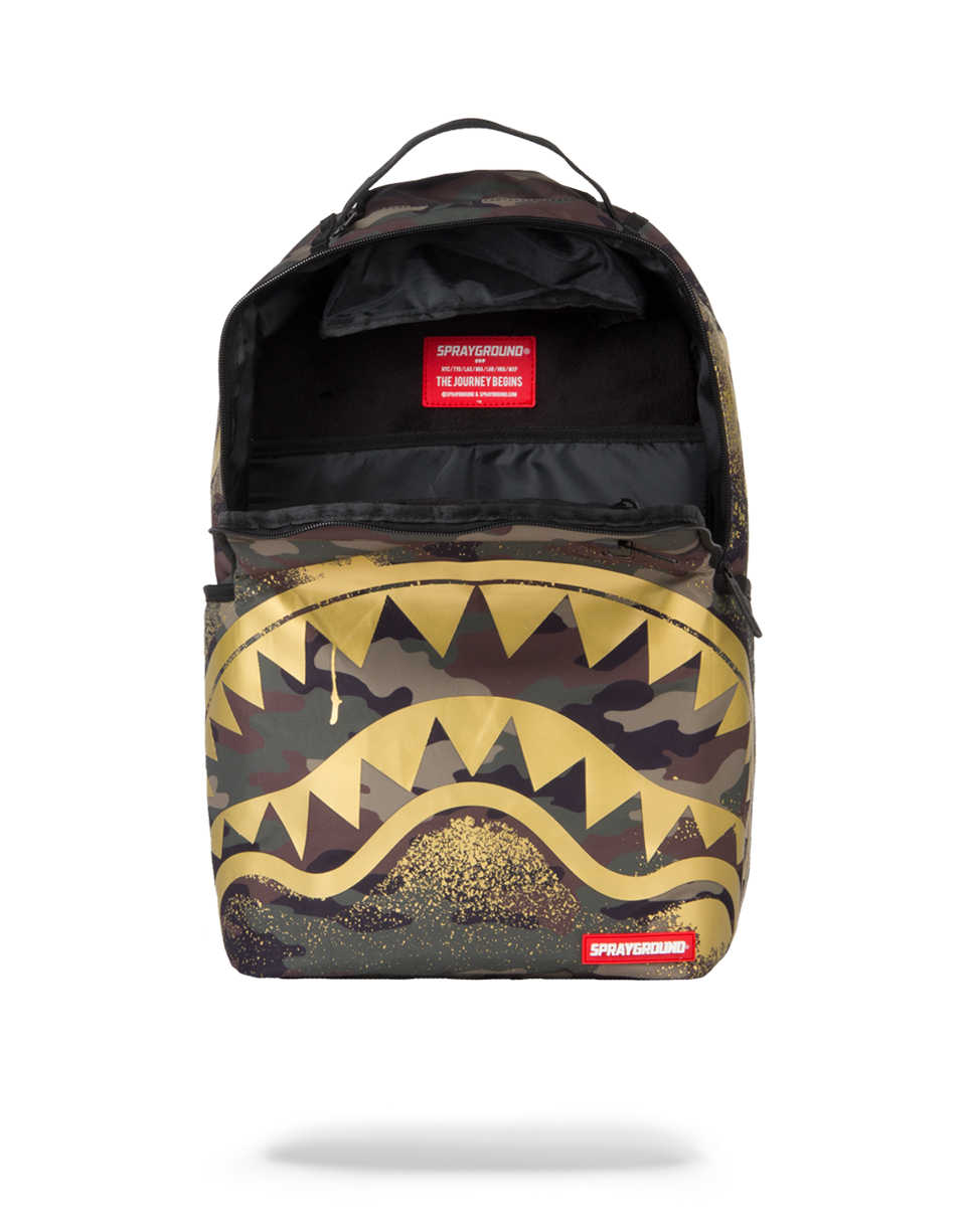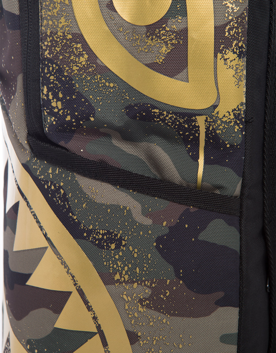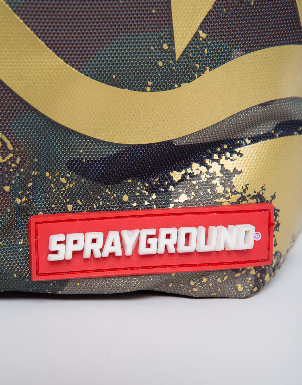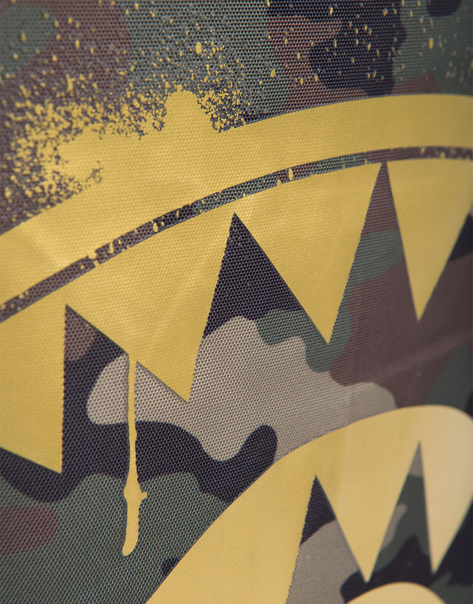 This is the Gold Stencil Shark Rucksackby Sprayground. The iconic shark mouth appears on the front of the bag in a gold spray print against a camo background. The bag was designed for travelling and is large enough for you to carry everything you need for your next trip. Featuring individual laptop and sunglass pockets, inside and outside pockets, and one strap making it easy to carry. All bags are limited edition and never produced again so get yours before they are gone forever!