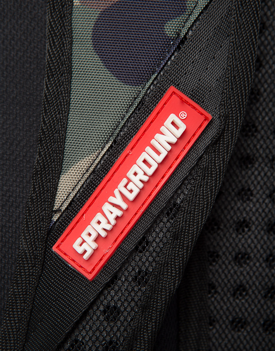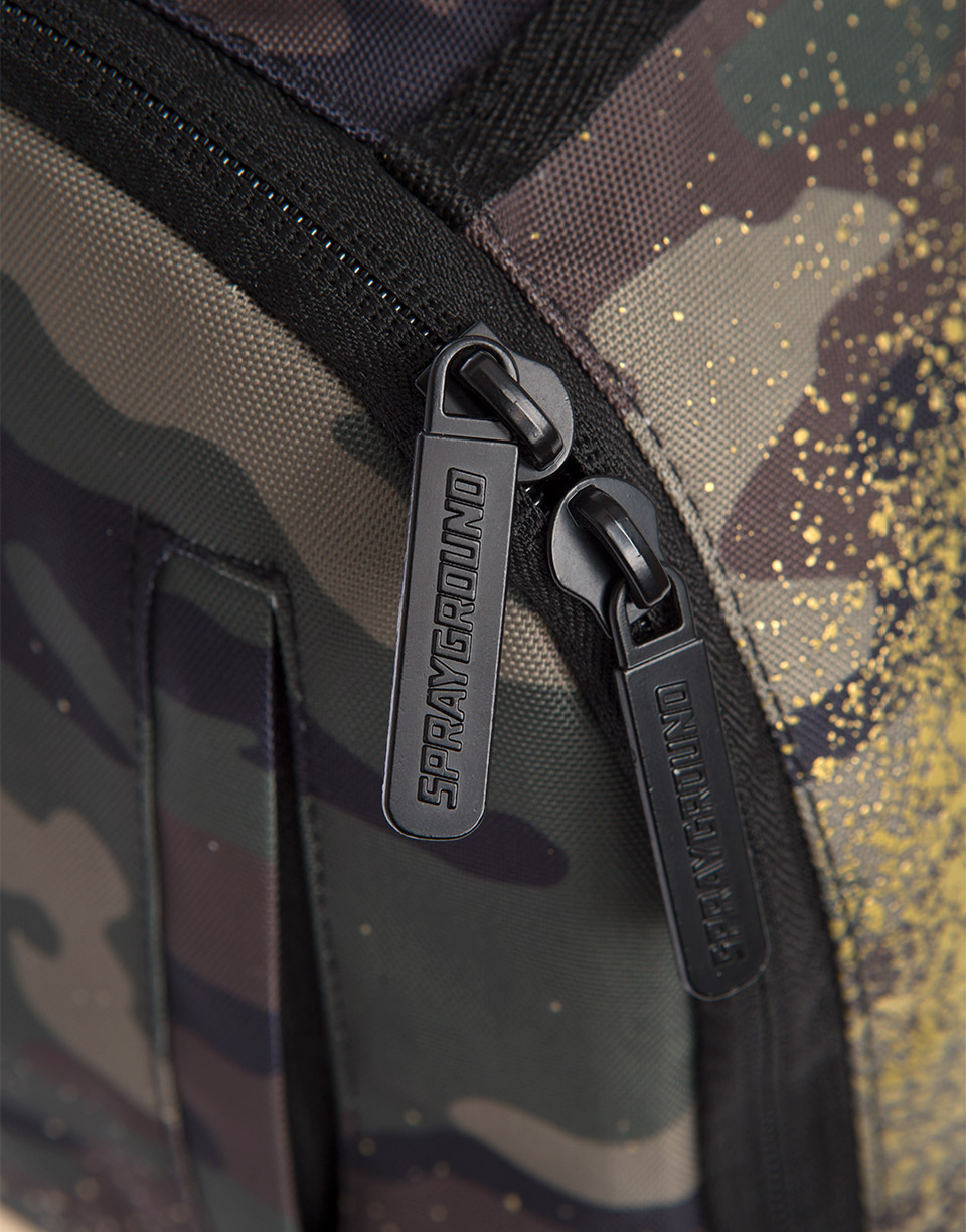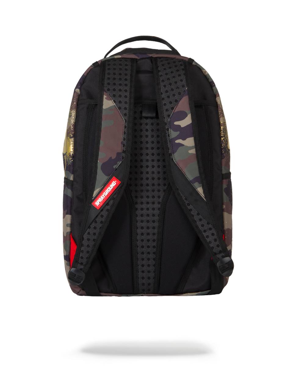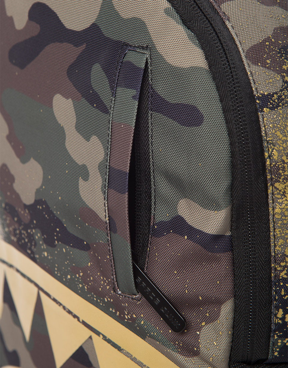 This is the Gold Stencil Shark Rucksackby Sprayground. The iconic shark mouth appears on the front of the bag in a gold spray print against a camo background. The bag was designed for travelling and is large enough for you to carry everything you need for your next trip. Featuring individual laptop and sunglass pockets, inside and outside pockets, and one strap making it easy to carry. All bags are limited edition and never produced again so get yours before they are gone forever!