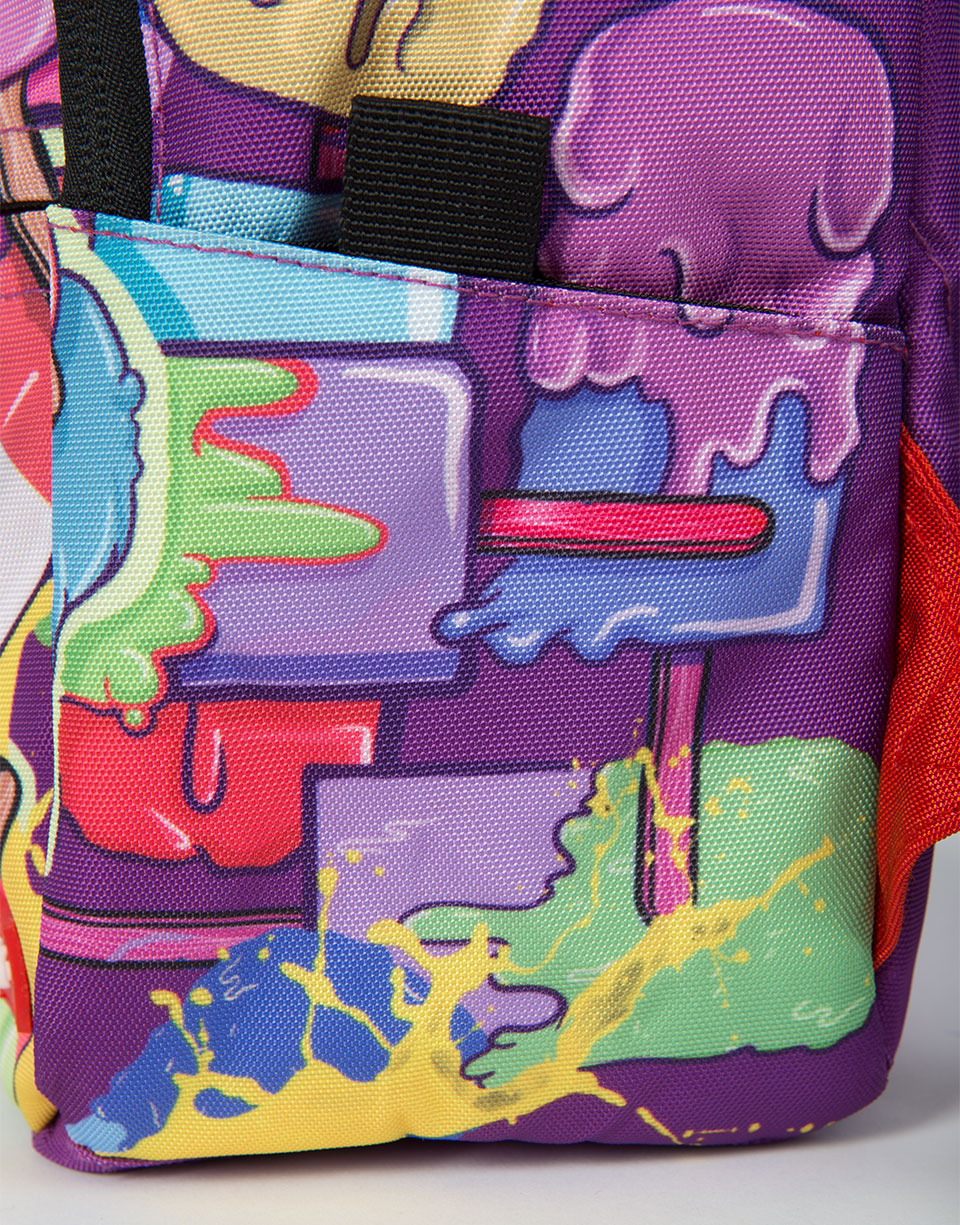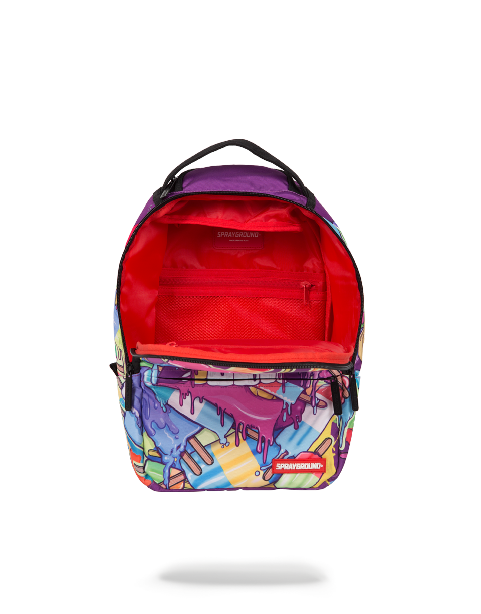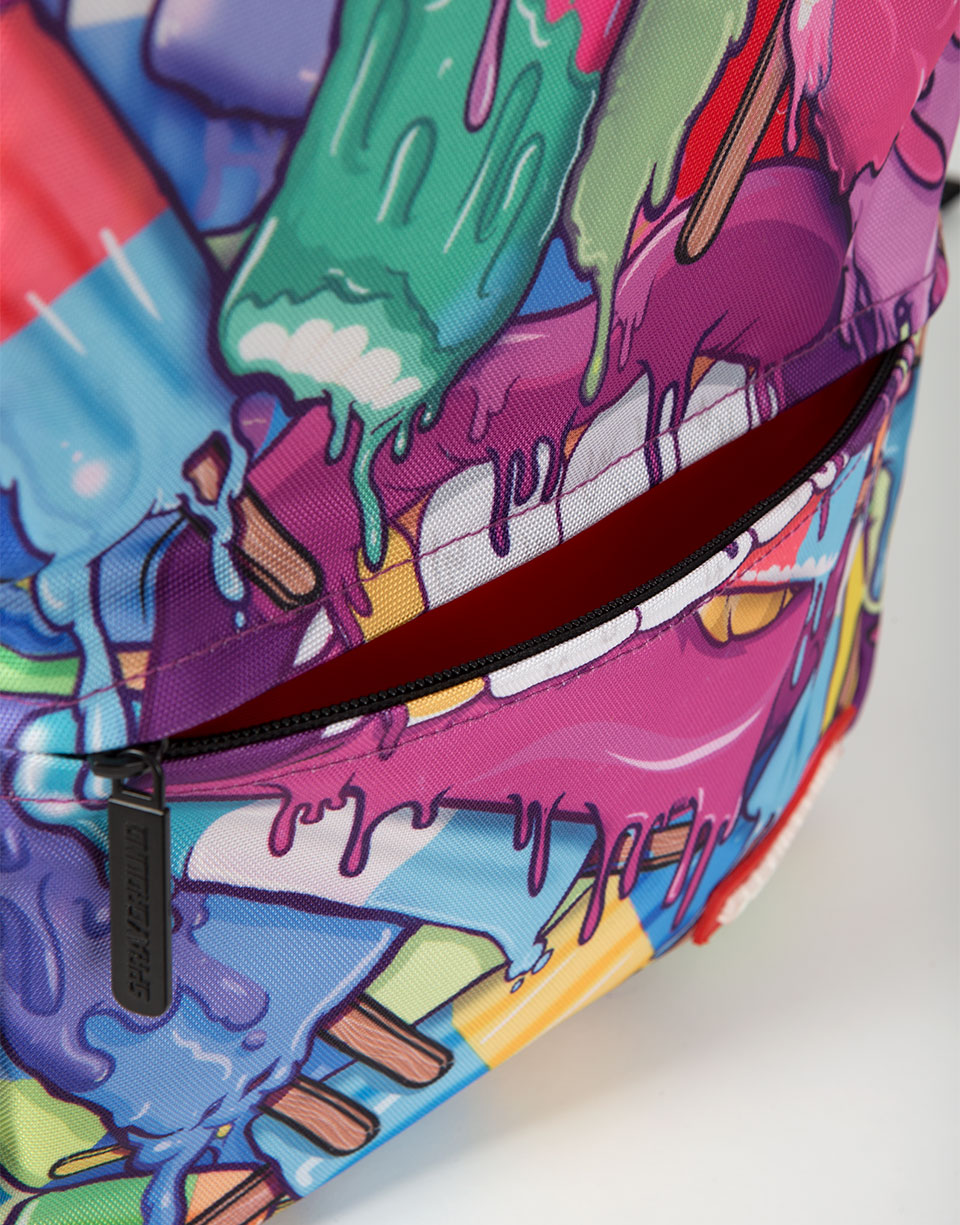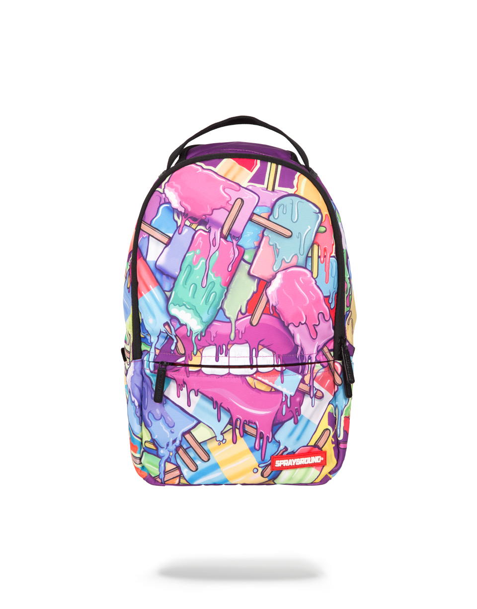 This is the Lil Popsicle Grillz Backpack by Sprayground. This mini backpack features a fun Popsicle print. Popsicles of all different colours incase this backpack, with a mouth on the very front portion of the bag. Featuring individual laptop and sunglass pockets with ergonomic straps big enough to hold a days worth of gear. All bags are Limited edition and never produced again.