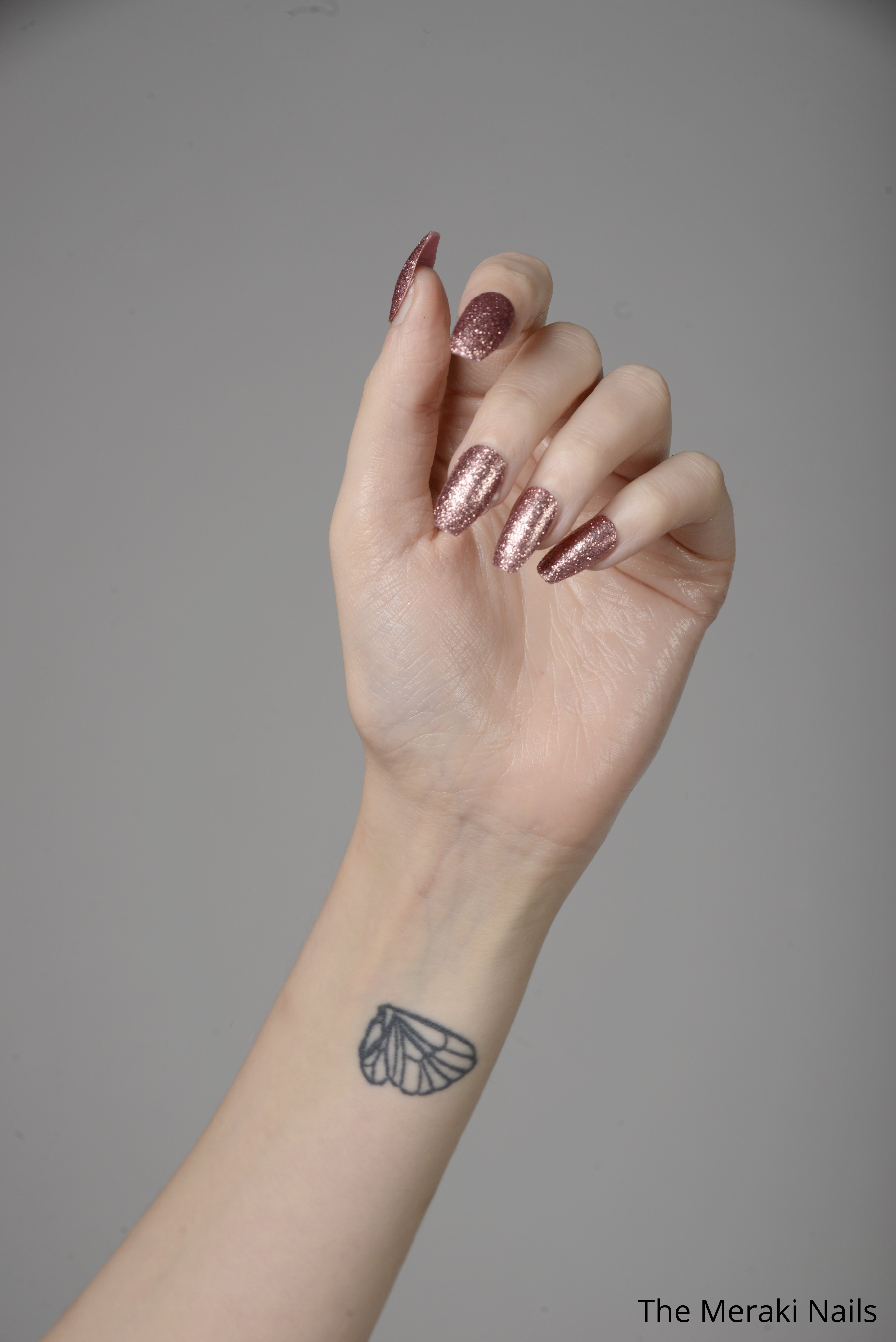 Meraki’s pop on nails give you the perfect manicure without the time, commitment or damage. These On-Trend pink glitter rhinestone nails can be worn for many days or weeks you decide.