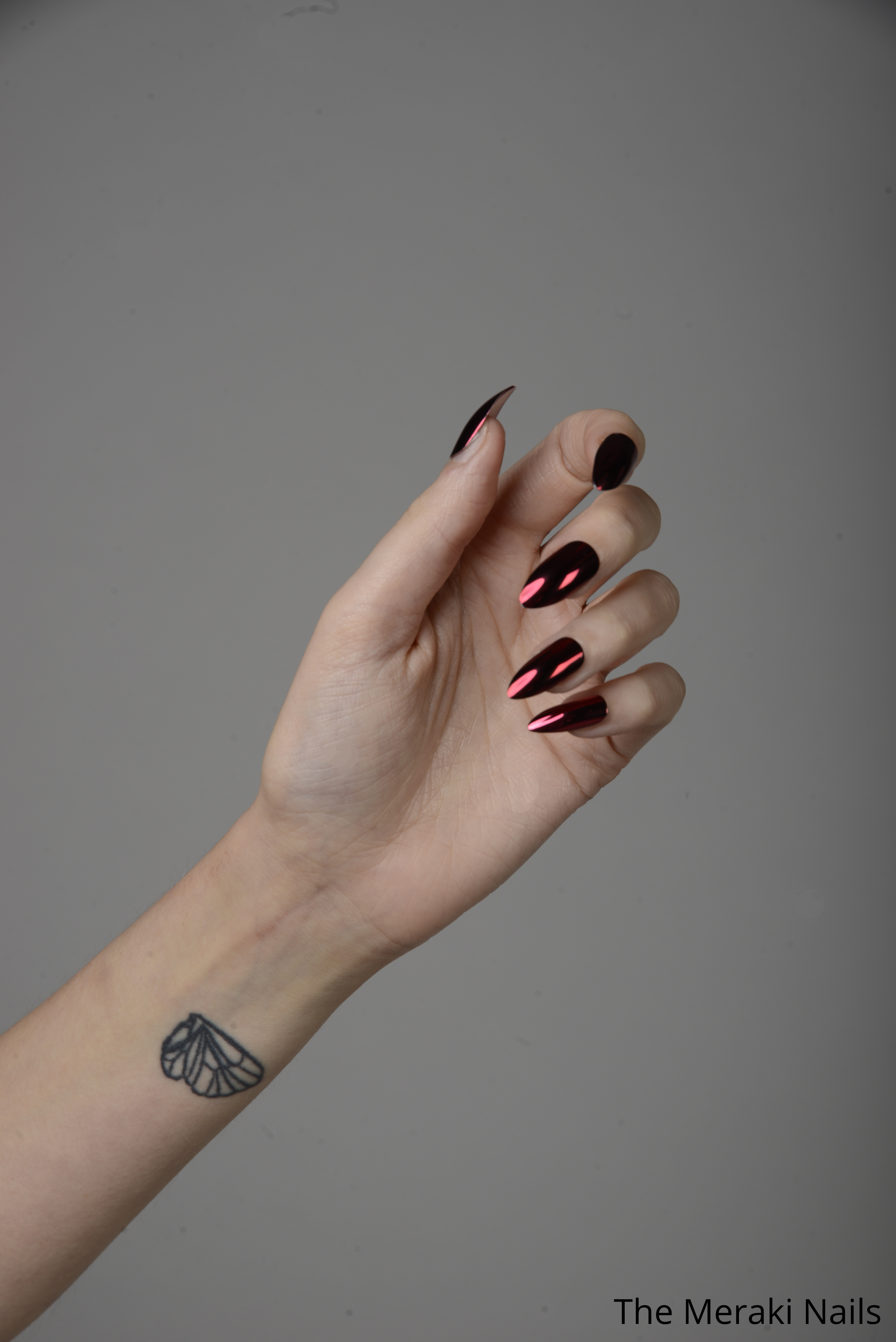 Meraki’s pop on nails give you the perfect manicure without the time, commitment or damage. These On-Trend red metallic nails can be worn for many days or weeks you decide.